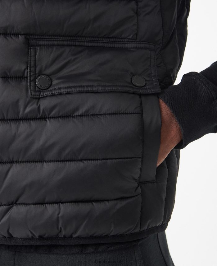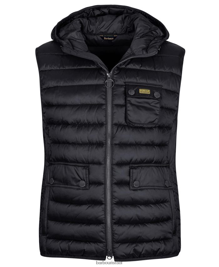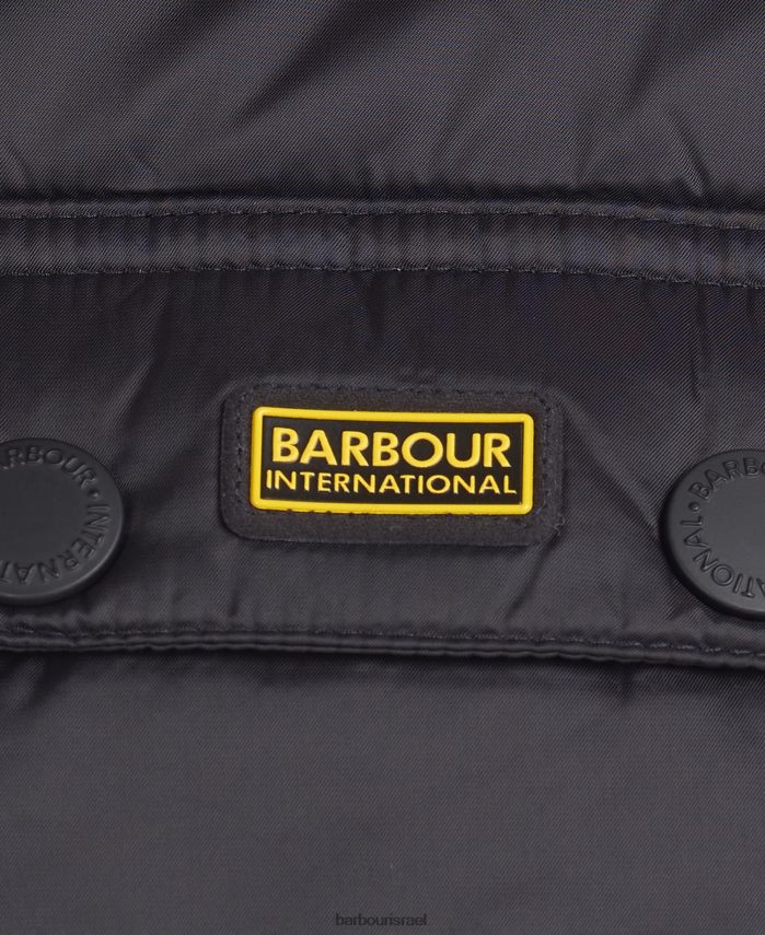 ה-barbour international outsten hooded gilet הוא פריט ספורטיבי עם כיסוי חיצוני מרופד, מכסה מנוע קבוע וקשירת לייקרה בשוליים ובחורי הידיים לתנועה קלה.