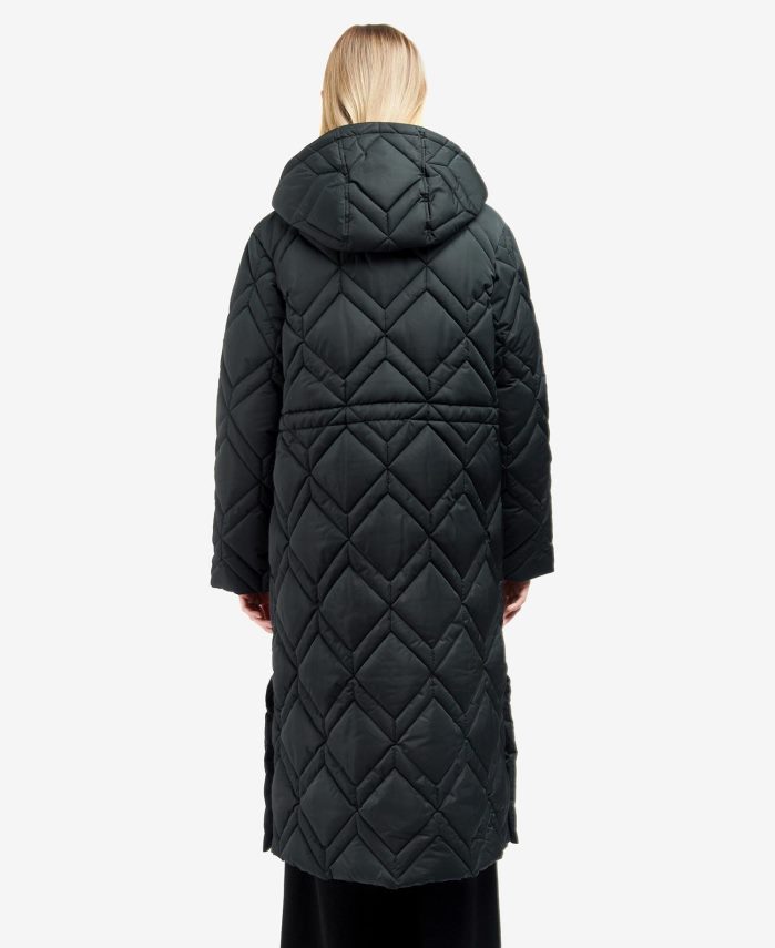 הז'קט המרופד של Barbour Cassius כולל עיצוב באורך ארוך עם שרוך גב המותן לגימור מחמיא. בגד זה מציג כרכרה בצוואר אחורית של טרטן, ומתהדר רקמת ברבור לכיס השמאלי.