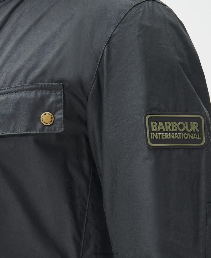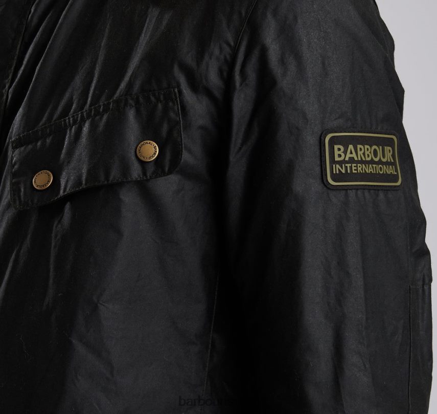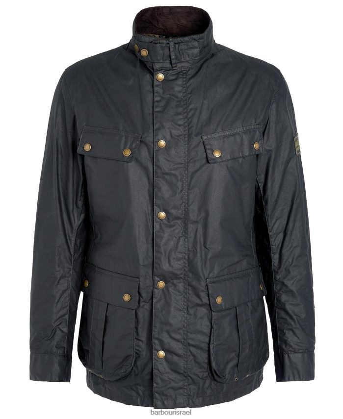 מראה קל משקל של ז'קט כותנה בשעווה של Barbour International Duke עם שני כיסי חזה זוויתיים ושני כיסי קפלים בקופסה תחתונה. יש לו בטנת כותנה קלה, בטנת צווארון קורדרוי וסגירות חתיכים בגווני זהב לכל אורכו למראה קלאסי.