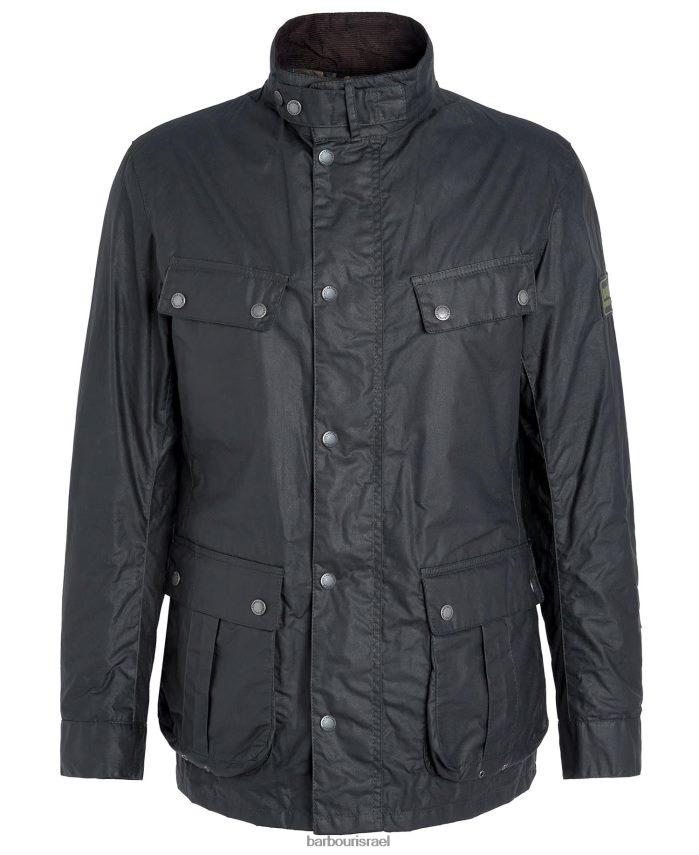 מראה קל משקל של ז'קט כותנה בשעווה של Barbour International Duke עם שני כיסי חזה זוויתיים ושני כיסי קפלים בקופסה תחתונה. יש לו בטנת כותנה קלה, בטנת צווארון קורדרוי וסגירות חתיכים בגווני זהב לכל אורכו למראה קלאסי.